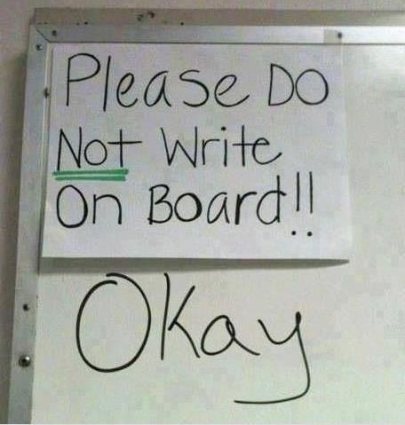 A clear label to not write on the board, to be followed by an affirmation which was written on a board. How funny!