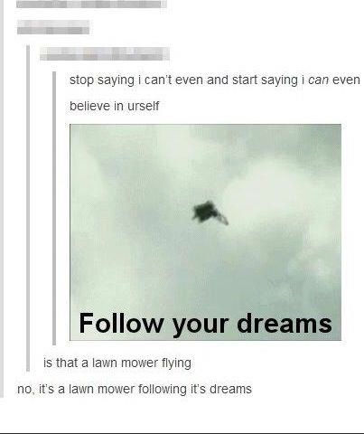 This is good advice. Always follower your dreams. Look at this lawn mower. It's definitely following its dreams. You can see it's flying high.