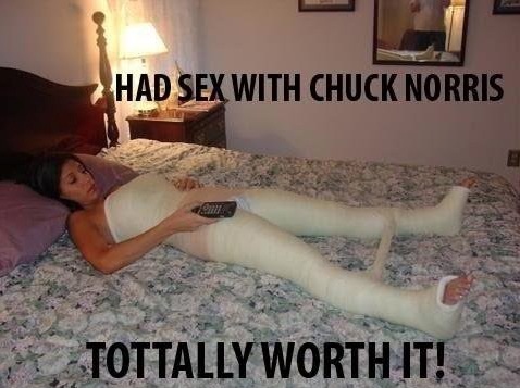 She had sex with chuck norris but it was totally worth it! Being the hospital for a few months and in a total body cast is fine with me for one night with chuck!
