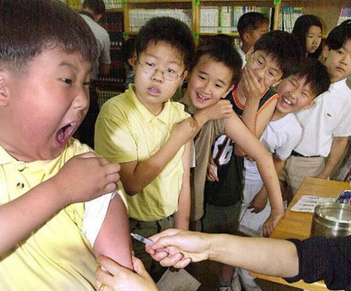 Funny pic of a boy getting his flu shot at school and how he is crying infront of all his friends.