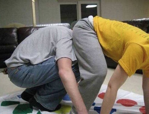 I can see this game got way out of hand. It's going to take all day to pull that guy's head out of the other guy's butt. Next time play checkers.