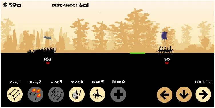 Left / Right Arrow Keys - Move. Down Arrow Key - Stop. Z or 1 - Shoot Arrows. V or 4 - Summon Humans. B or 5 - Summon Centaurs.
