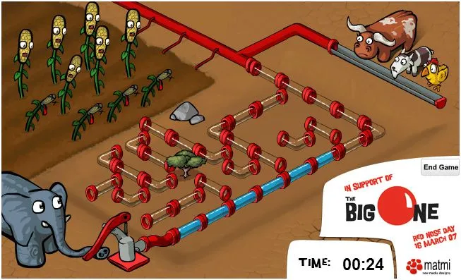 | Description: | This game was made for free to support UK's Red Nose Day (UK March 16th 2007). Rotate the pipes so that they connect from the pump to the crops and animals before the time runs out. Watch out for spillages, and don't forget to pump the water to get it mov |
