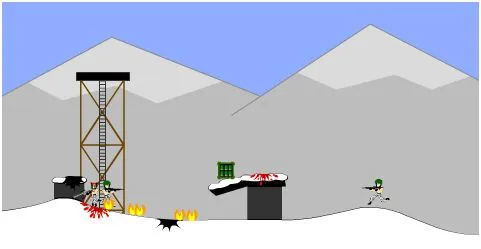 | Controls: | A (hold)- Move left. D (hold)- Move right. W (hold)- Climb up ladder. S (hold)- Climb down ladder. E- Throw Molotov Cocktail. R- Throw Shrapnel proximity mine. Spacebar- Jump (Double tap to double jump) Left CTRL: (Tap once) Crouch (provides better |