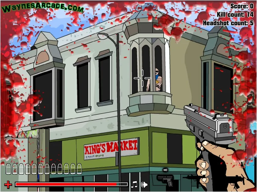 | Controls: | Use the mouse to aim the crosshairs, left click to shoot. Press the space bar to reload. Use the number keys to switch weapons. |