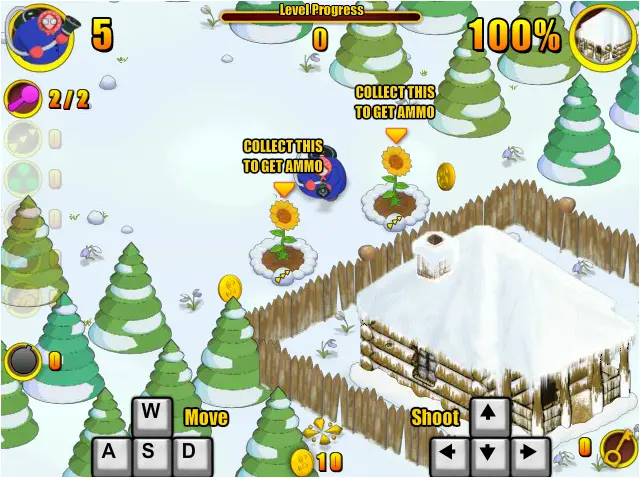 | Controls: | Aim and Shoot with mouse Move with WASD or Arrow SPACE – launch grenade Q/E – change weapon 1,2,3,4,5 – select weapon ESC or P – pause and game menu M – mute sound and music |