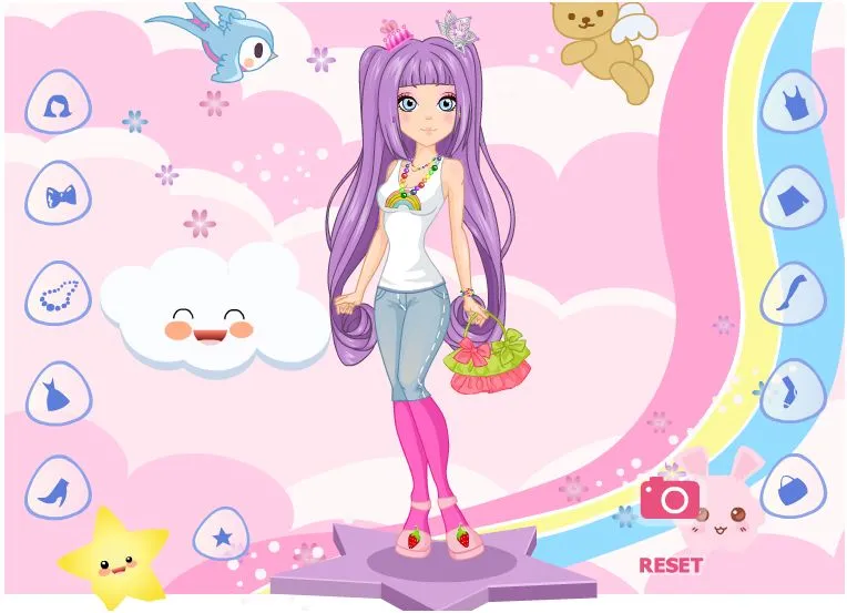 | Controls: | Use your mouse key to click on and through the floating hair, clothing, and accessory options for this cute little cosplayer. |
