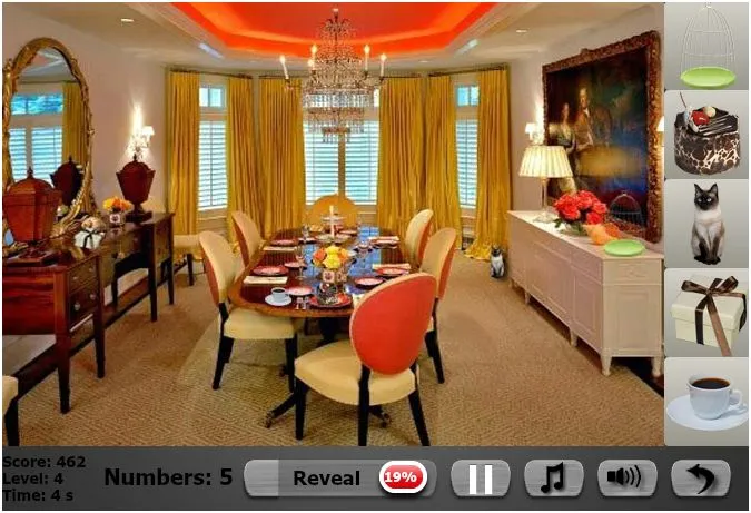 You have to find five objects that hidden on the pictures.To pass each level, you must find all the hidden objects. If you need assistance, use the hint.
