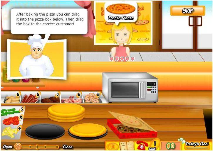 Help the pizza pronto chef to create the best and fastest pizza delivery restaurant ever known. Serve your customers with a big smile and of course on time! Build upgrades for your restaurant (such as an extra oven!)