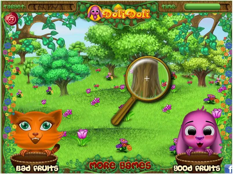 use the mouse to interact with the magnifying lenses and search for fruits. Drag and drop the good fruits in Toto's basket and the bad ones in Sisi's basket.