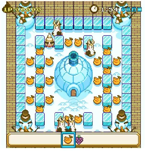 Break the ice blocks and break them, collect fruits and avoid being flattened by the enemies!