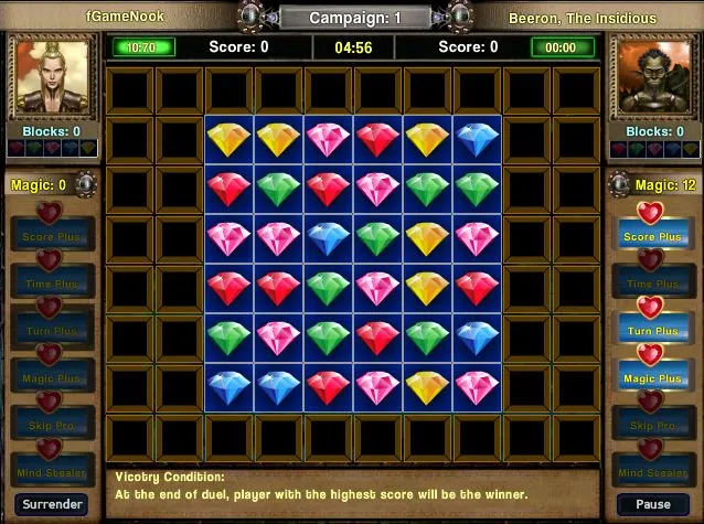 A fun match 3 game where you will need to play against increasingly difficult players before you can play against the Elf King and win the game. Beat the Elf King in this challenging match 3 game. To get to the Elf King you'll need to fight your way throu
