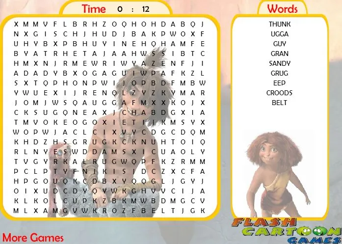 | Description: | Find the characters' name from the popular cartoon, The Croods. The letters scramble every time you start a new game, so there is a new game every time you play. Click and drag to highlight the group of letters that make up the word. If the letters you hi |