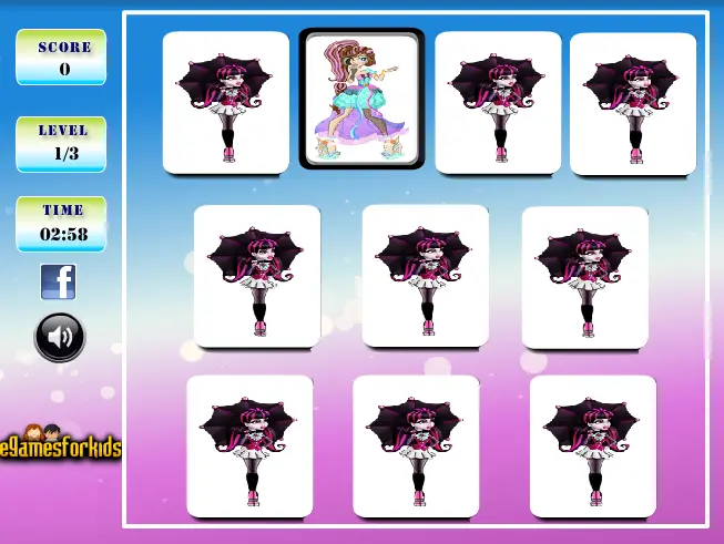 Find matching pairs of Monster High characters of cards by clicking on them. Match all pairs of cards within time duration to go into next level.