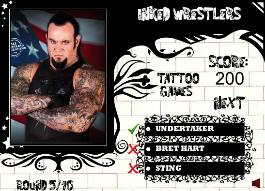 | Description: | Did you know almost everything about wrestling? Wrestlers are famous for their tattoos, test your know ledges and try to recognize them. We will show you a tattoo, guess on which wrestler's body is on, choosing the right answer from three possible answers |
