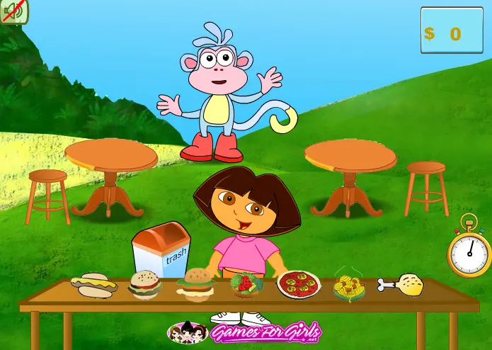 Take customer orders from Dora friends and serve up some tasty food for summer cash.