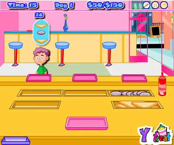 | Controls: | Watch the bubble over the customer head and drag the ingredients in the same order and deliver them to the customer. Mistakes are alright, but should be dragged to the bin. Keep customers happy and never miss any of them. Do collect money, from happy cust |
