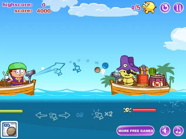 Fire different types of cannonballs at the pirate ships as you hit crates & their ship to sink it.