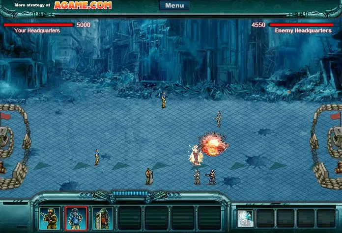 | Controls: | Build units to attack the enemy headquarters and defend your own. Press Up/Down to switch between the five attack lanes, then click on the unit icons to build a unit in that lane. Click on the special ability icons when they are fully charged to use an ab |