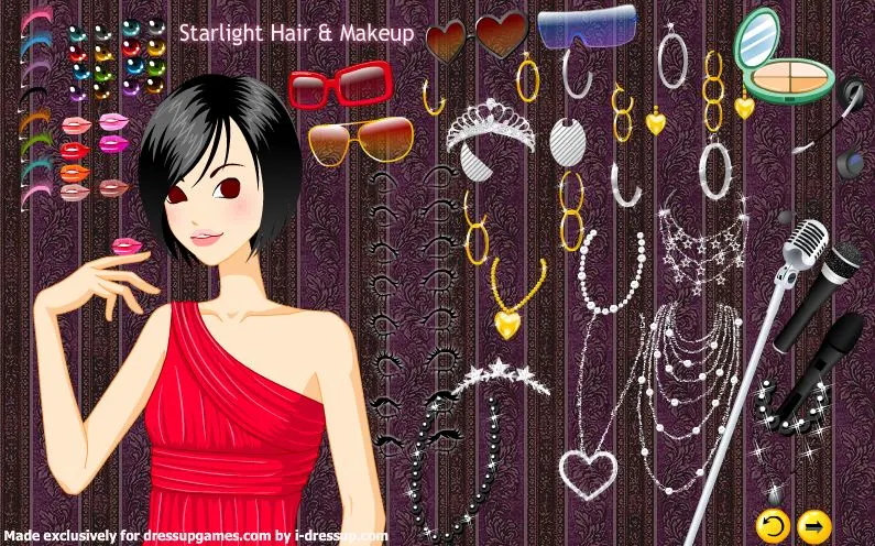 Starlight Hair and Makeup salon is where celebrities get their hair and makeup done! In this game your mission is to give choose a hairstyle, clothes and give hear a great makeover before she goes on stage.
