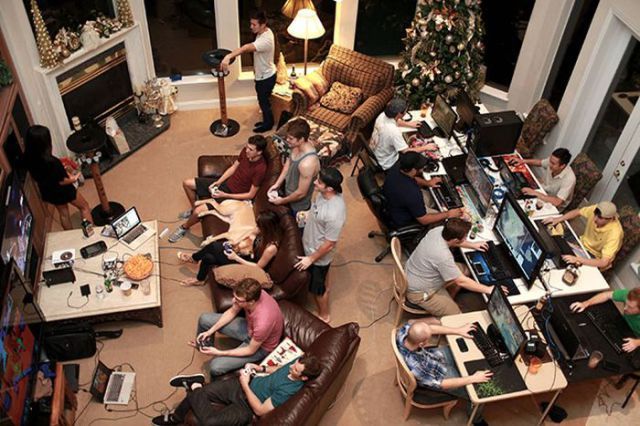 This is what a geek party looks like, yes at a college party you fiend alcohol and alcohol games here you fiend computers and nice video cards.