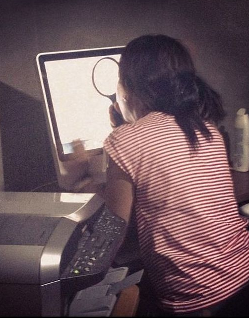 This girl is such a genius. She uses a microscope to read the illegible items on the computer. I don't think she's familiar with the zoom function.