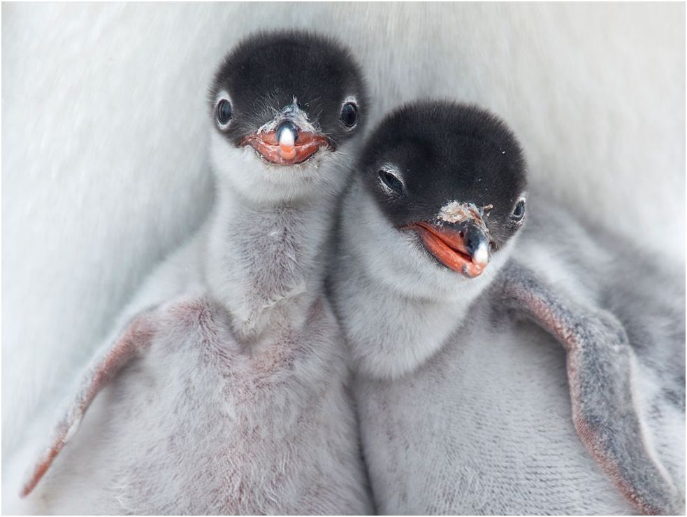 n Port Lockroy, Antarctica, two newly hatched gentoo penguin chicks get a quick look at the outside world as one of their parents stands up on the nest for a moment.