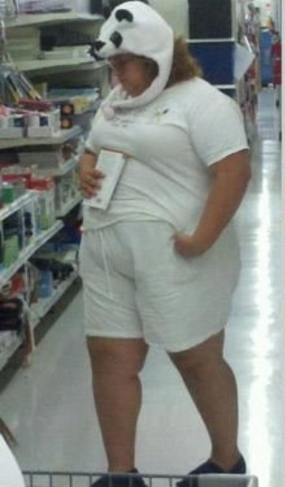 Well she definitely looks like a giant panda. I give her a 10 for matching the panda exactly. The only problem is walmart is not a halloween costume party