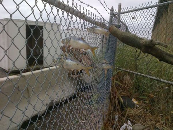 The little fishes are trying to jump from pound to the grass and they got stuck in a fence.
