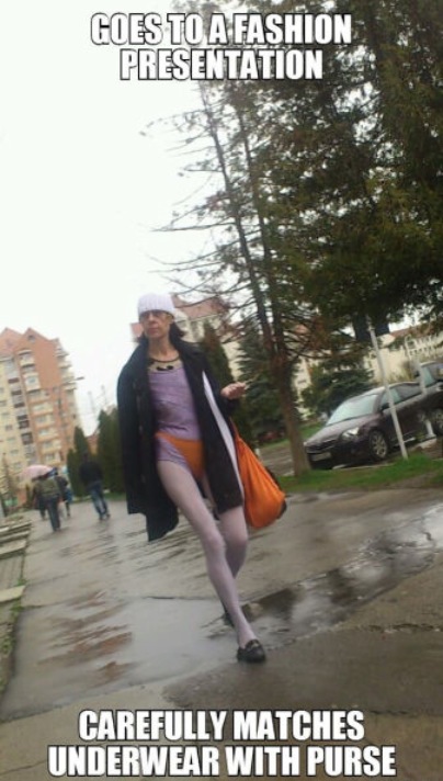 Goes to Fashion Presentation Carefully Matches Underwear with Purse Fashion Fail.