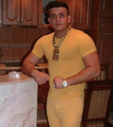 This guy really likes gold. Gold outfit gold jewelry gold everything! He must be running one of those places that buys gold online and he's the pitchman.