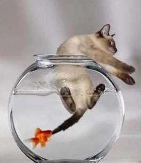 Yep how do you like it goldfish told the cat after she bit him on the tail. the cat is trying to escape the fish tank.