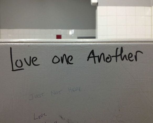 This was the graffiti in one of the public bathroom LOVE ONE ANOTHER just not in here bro