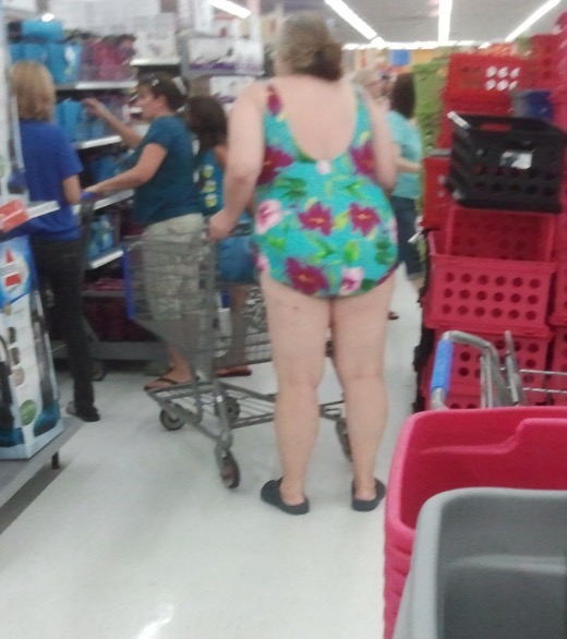 This is exactly what I want to see at Walmart when I'm trying to pick up some snacks. Nothing like pasty white legs in a bathing suit to make me long for winter.