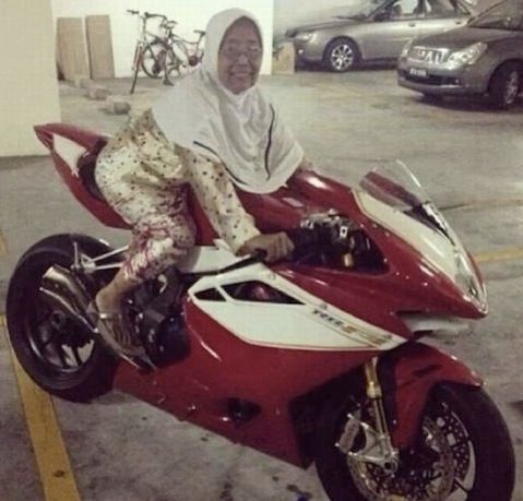 This lady looks pretty daring. I would say grandma has no fear. I would suggest keeping it in first gear and no wheelies.