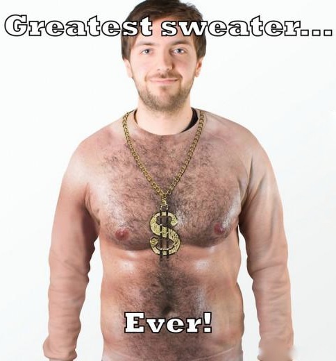 Greatest Sweater Ever!!! Hairy Chest and Gold Chain Shirtless Shirt Costume