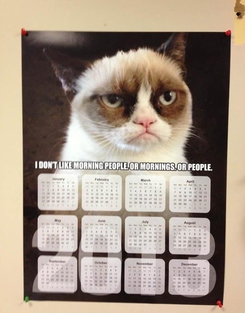 I don't like morning people or mornings or people. That grumpy cat is such a grump! Every month of every day of the year she has a frown on.