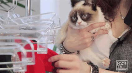 Watch grumpy cat going through the clothes rack looking for something to wear. It looks like she is quite the shopper!