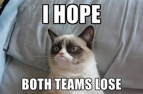 I hope both teams lose! I guess grumpy cat isn't picking a winner in the super bowl this year. The baltimore ravens vs the san francisco 49'ers score zero zero. FUNNY!