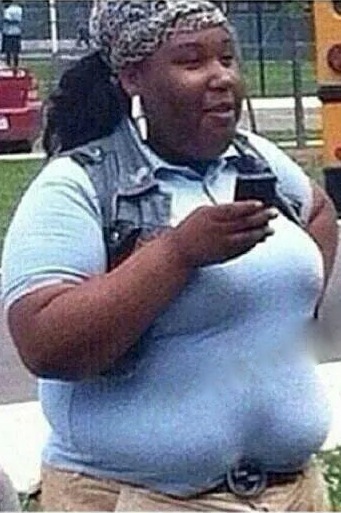 I can't tell whether her stomach looks more like a butt or boobs. Either way that belt buckle doesn't have much more time it's ready to pop