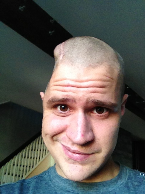 He looks like he's very normal except for a huge chunk of missing skull on the right side of his head. At least he is smiling