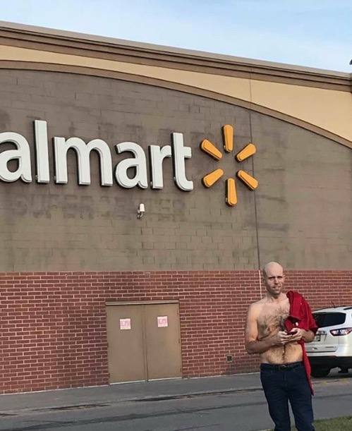 Half off all shirts at Walmart. The problem is you only get half a shirt! This guy needs to take the hair on his chest and put some on his bald head.