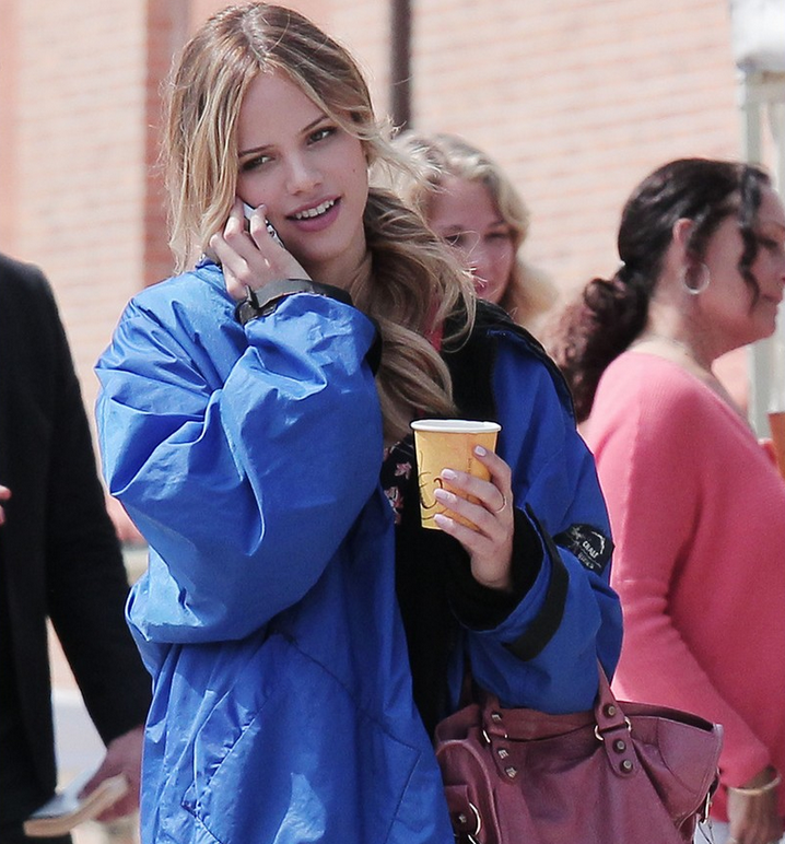 Halston Sage takes a quick phone call on the set of her new NBC pilot in Los Angeles on Tuesday afternoon.