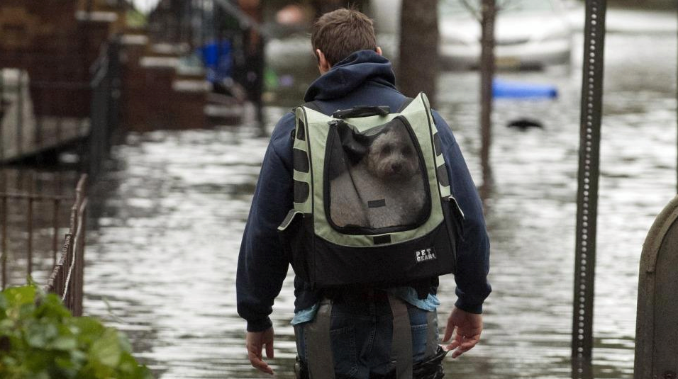 A man walks along a flooded street in Hoboken, NJ. He has his puppy in his backpack.
