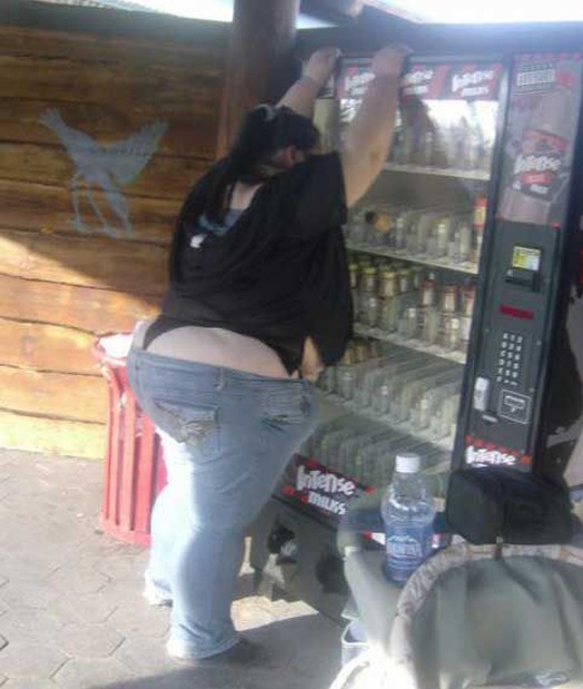 This woman is less than happy with the vending machine and it's time to tip it over to get back her money or drink. She is definitely dressed for the occasion. Great thong.