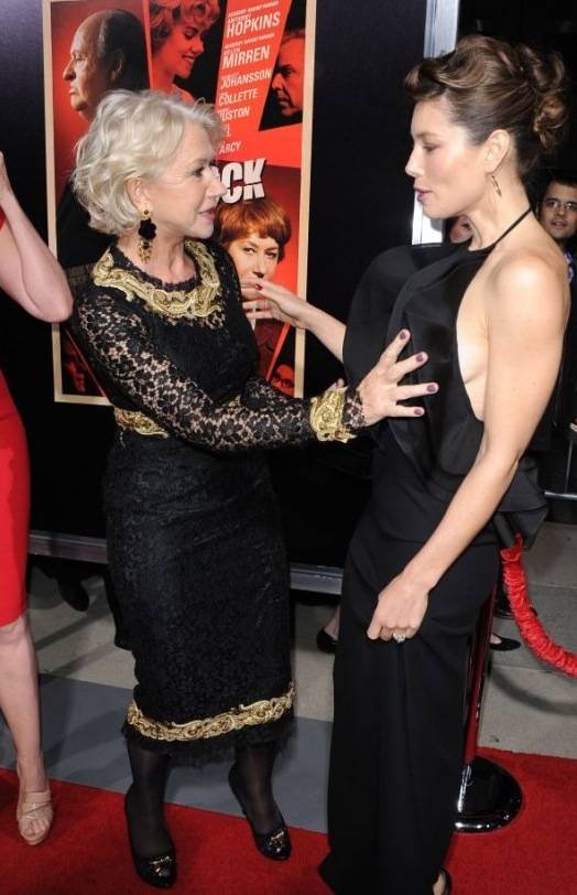 Helen Mirren grabs Jessica Biel Boobs at Hitchcock premier while standing on the red carpet.