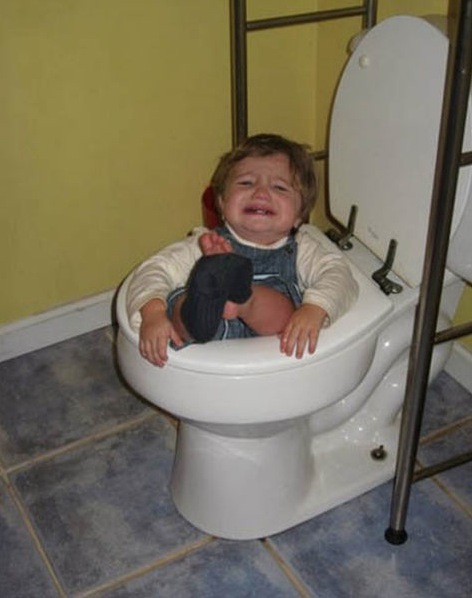 This poor kid. It's bad enough to fall but when you fall into a toilet bowl and onto your own poop then it really stinks. He's going to stink for a while.