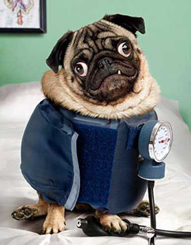 Cute little dog is wearing a blood pressure on him and he pumped it to the high and now he can't breathe.