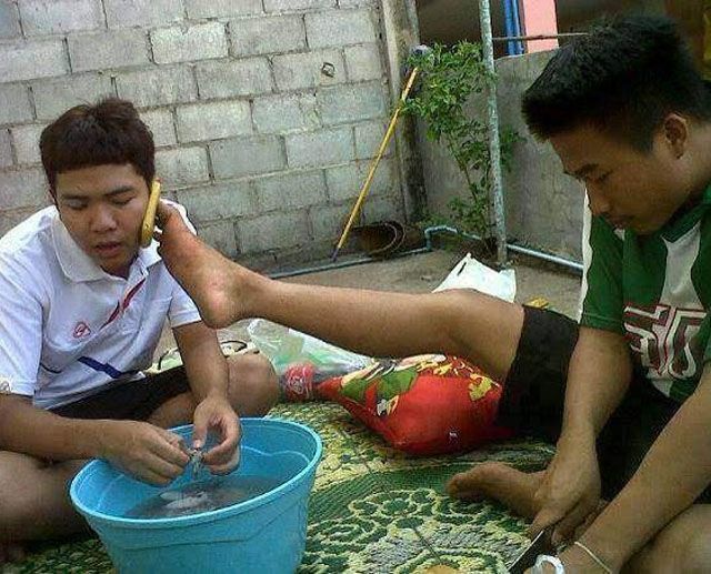 Hey can you give me a hand? I have an important call I need to take. No but I have a foot I can lend you.