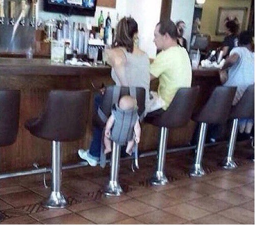 I guess taking a baby into a bar is bad enough, but hanging them on the back of a chair now that's just plain crazy. Somebody call the cops on this woman!